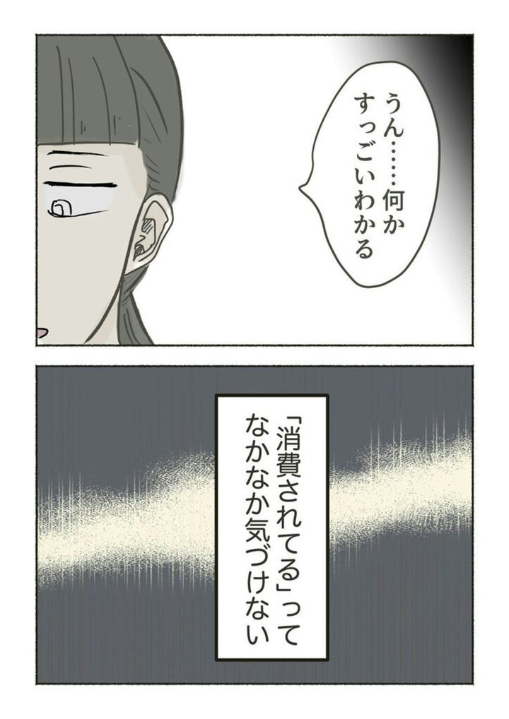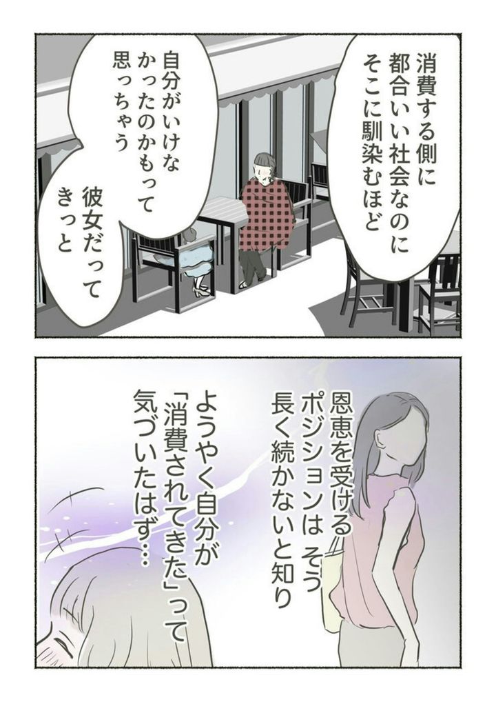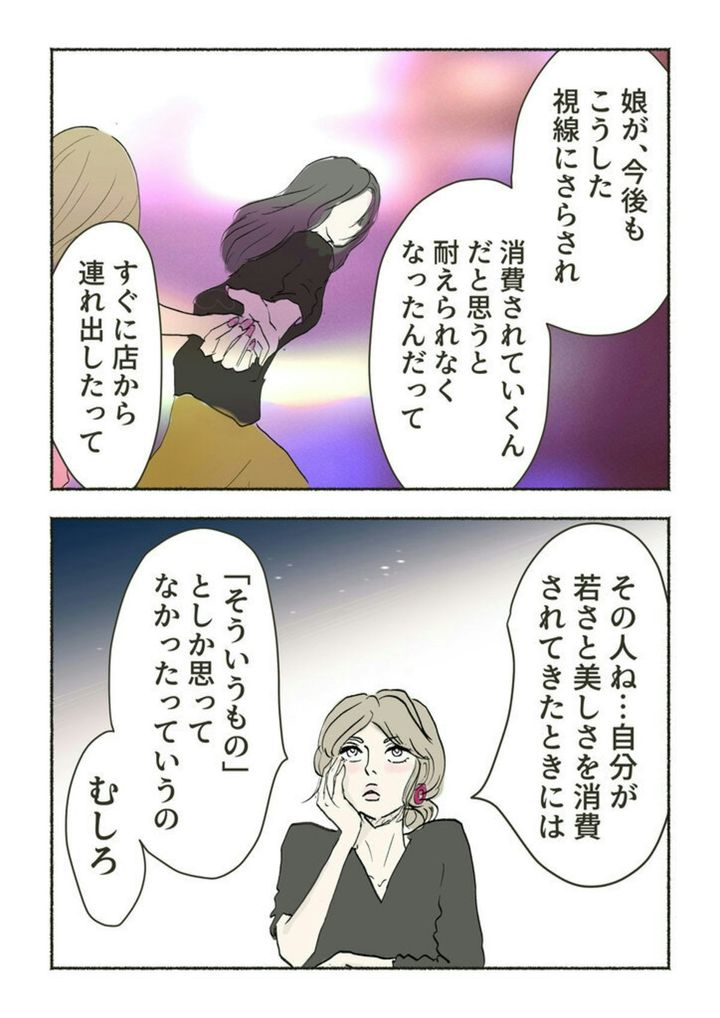 若さと美しさを引き換えに「恩恵」を受けていたころは、自分が「消費されている」ということには気づきにくいですよね。若さと美しさを持てはやす人たちの視線の奥、言動の先に、一体どんな思考があるのか…これは本当に「この時代」を抜けてみないと気づかないことなのかもしれません。