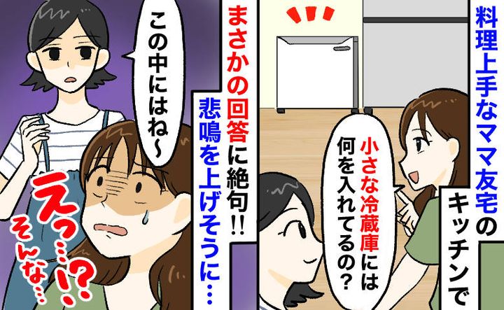 ママ友の家には、大きな冷蔵庫のそばに小さな冷凍庫もあり、「さすがお料理好きな人は違うな〜」と感心していました。興味本位で「この小さい冷凍庫には何を入れてるの?」と聞いてみると、ママ友が扉を開けて中を見せてくれたのですが――。