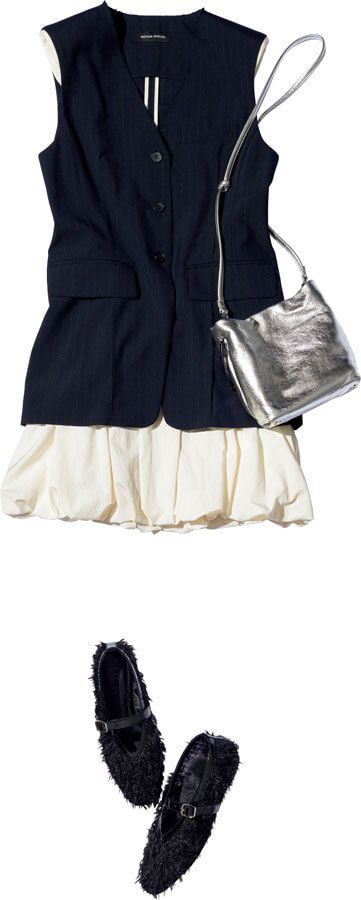 「コーディネートがモノトーンのときは、素材感のある小物で個性と奥行きを(by ヨンア)」ジレの裾からちらりと見せたバルーンヘムが大人可愛い♡ 女の子同士で集まる会はトレンド直球コーデで。ジレがピリ辛なぶん、ふんわりミニで可愛らしさもひとさじ加えて。