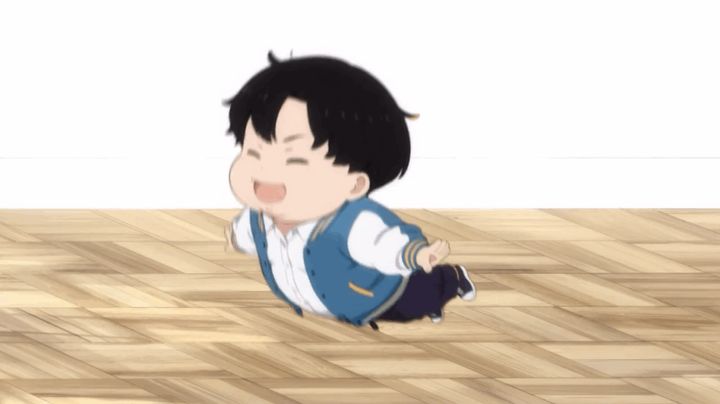喜びのあまり抱き着こうとした祐樹をあさぎが避けると、祐樹は床にボヨンボヨンと跳ね返った。