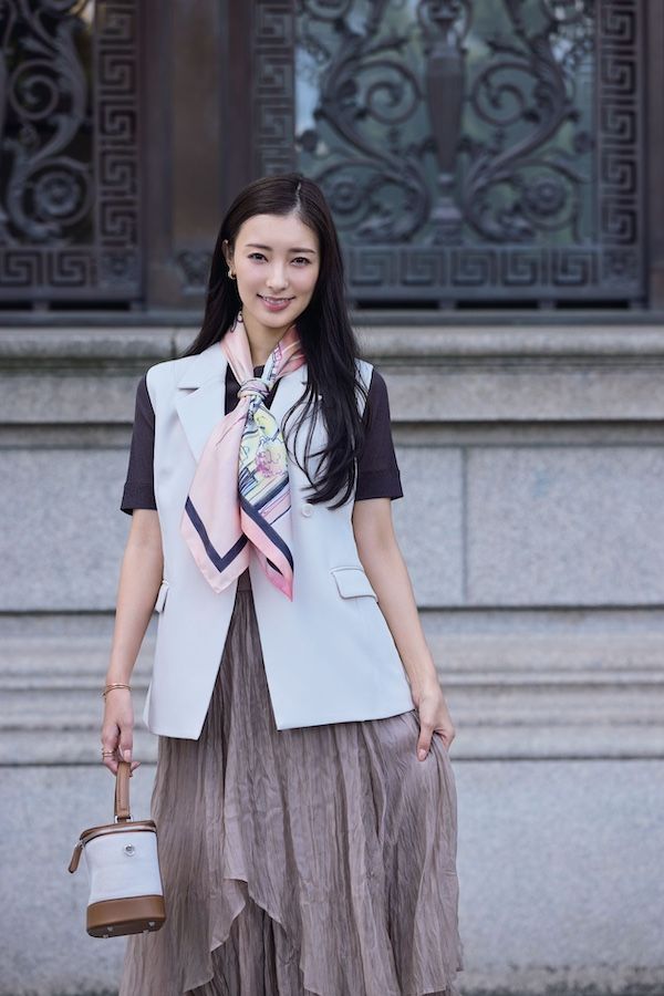 3. 大判ならアレンジ自在!通勤服の定番・ジレには【縦巻きスカーフ】で華やかさをプラス