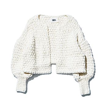 オフ白ハンドニットカーディガン/HER. 表情のある手編みニットは綿100%。タウンユースはもちろんのこと、水着の上からさらっと羽織ったり。