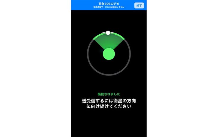②画面に「衛星の方向」が表示されるので、その方向にiPhoneを向けて通信開始。