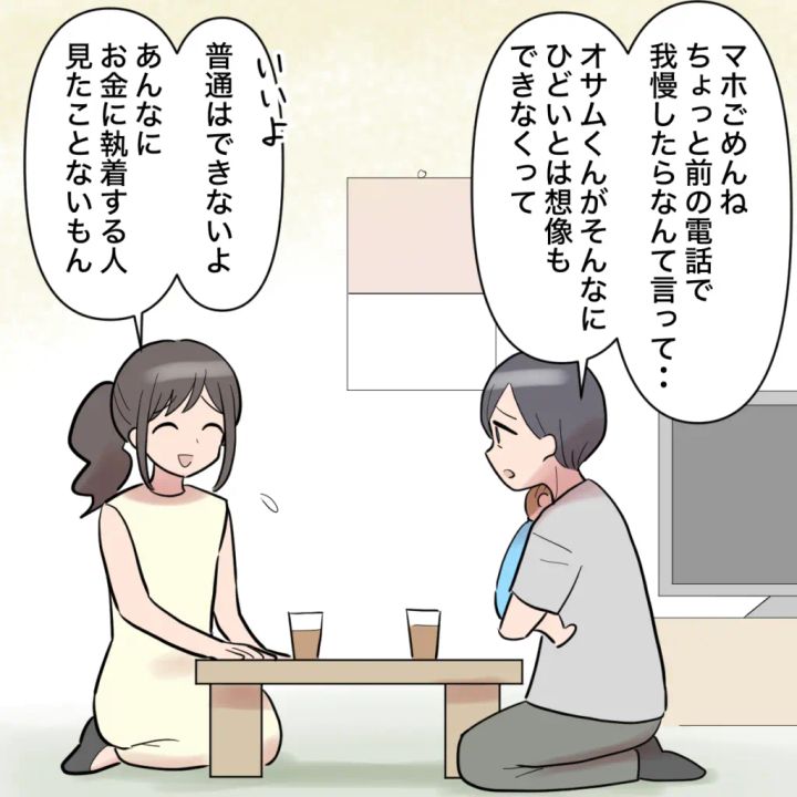 そして、「マホごめんね。ちょっと前の電話で我慢したらなんて言って・・オサムくんがそんなにひどいとは想像もできなくって」お母さんの言葉に、「いいよ。普通はできないよ。あんなにお金に執着する人見たことないもん」と呆れたように答える私。