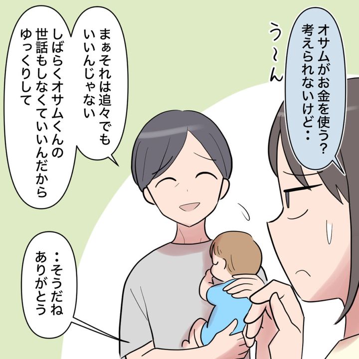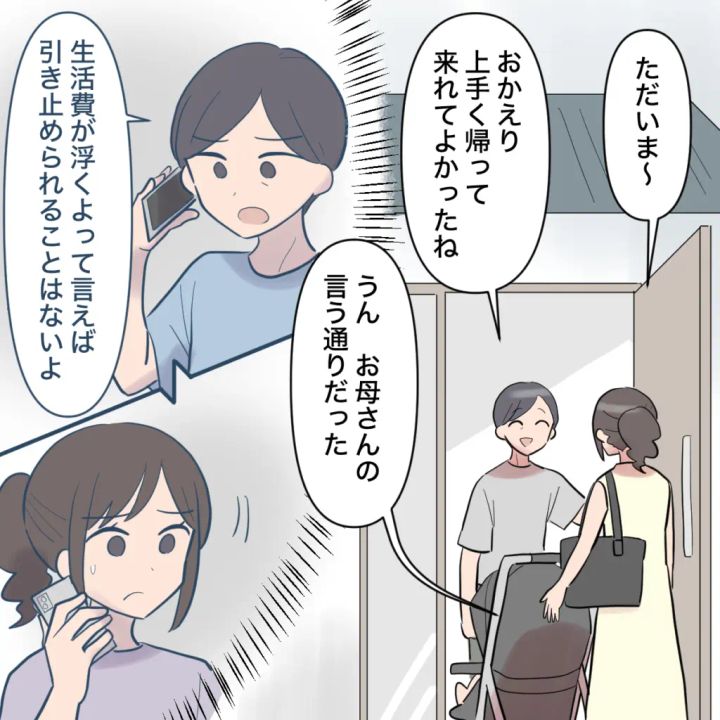 メグルくんを連れ、実家に帰ったマホさんは、「生活費が浮くよって言えば、引き止められることはないよ」と義母に言われた通りにオサムさんに伝え、本当に引き止められることなく実家にやって来た経緯を伝えました。怪しいという思いが打ち消せず、モヤモヤするマホさん、オサムさんが何をしているか、暴いてスッキリしたいですよね。