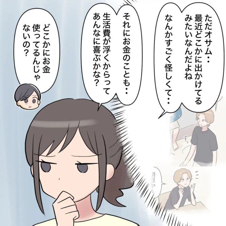 「ただオサム・・最近どこかに出かけてるみたいなんだよね。なんかすごく怪しくて・・。それにお金のことも・・生活費が浮くからってあんなに喜ぶかな?」考え込む私に、「どこかにお金使ってるんじゃないの?」お母さんの言葉に、