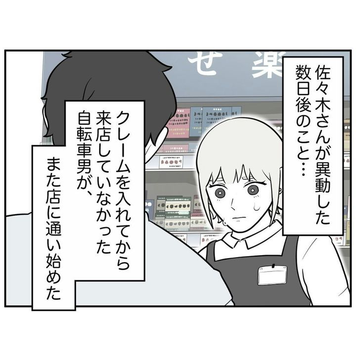 彼はいつもほや助さんの接客を名指しして希望し、どんなに少額の買い物でも手書きで領収書を書かせるのでした。そして、日を追うごとに彼はほや助さんに近づくようになり、とうとう佐々木さんというベテラン社員がほや助さんをかばった際、店内で大声をあげて怒りをぶちまけました。その後、自転車男は「佐々木という店員にほや助さんとの仲を邪魔された」と本社にクレームを入れたのですが…。