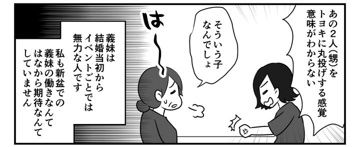 義妹とは前から馬が合わないと思っていたけど、ますますキラいになりました。大人として、もっと協力的な態度がとれないものでしょうか。