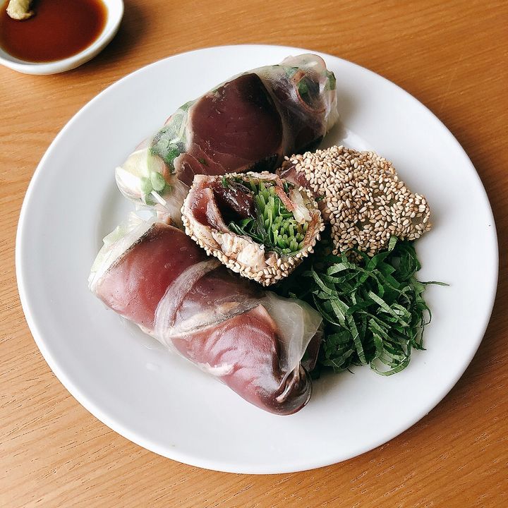 こちらはカツオと一緒に薬味をもりもりに重ねて巻いた生春巻き。まわりに白ごまをたっぷりつけて、わさび醤油でいただけば、口の中が涼しくちょっぴり刺激的な香りで満たされます。