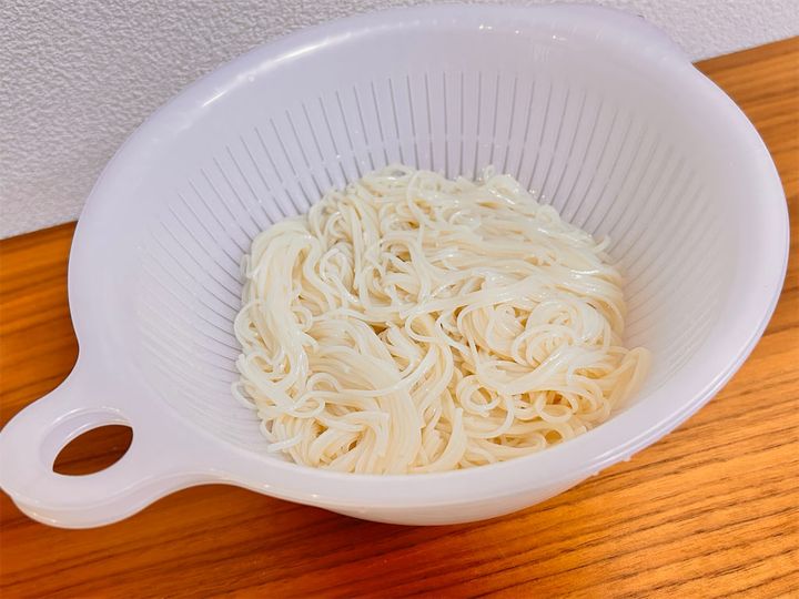 洗ったそうめんは、ざるに上げて水気を切っておきます。