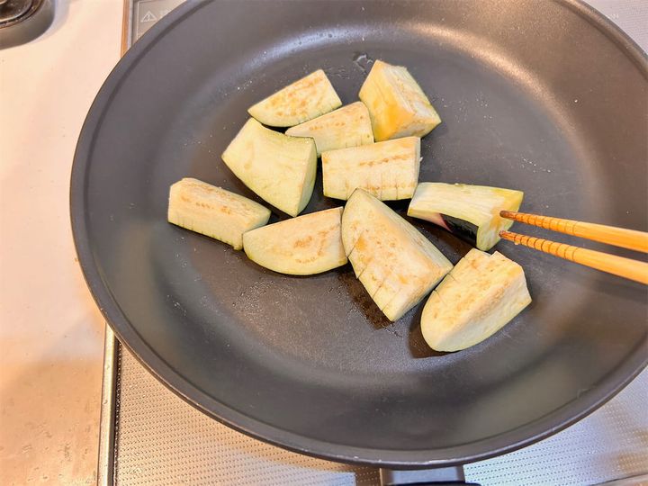 なすにゴマ油を絡めてあるので、フライパンには油を引かずに焼いてみます。