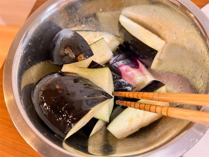 4.2のなすの水気をキッチンペーパーで拭き取り、ゴマ油を絡めます。