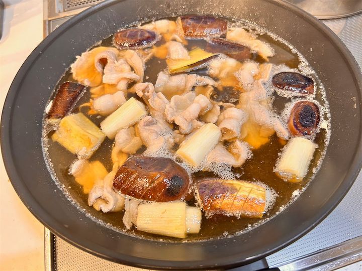 具材全体に火が通ったら、水、めんつゆ、鶏ガラスープの素、みりんを加えて沸騰させます。