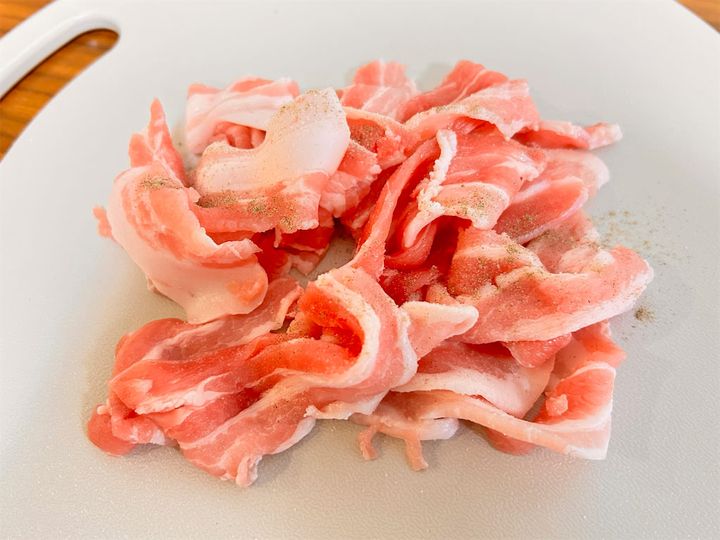 豚肉も食べやすい大きさに切って、塩、こしょう(ともに適量、分量外)を振ります。