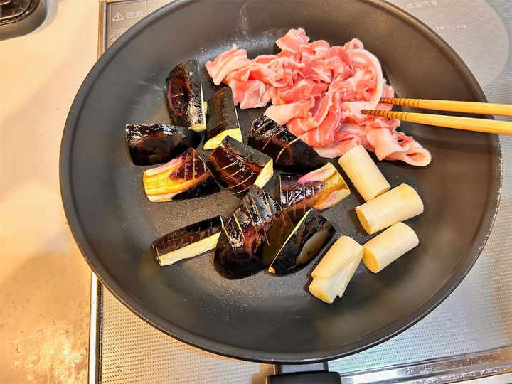 なすの皮に火が通ったら、長ねぎと豚肉も加えて、引き続き中火で焼いていきます。