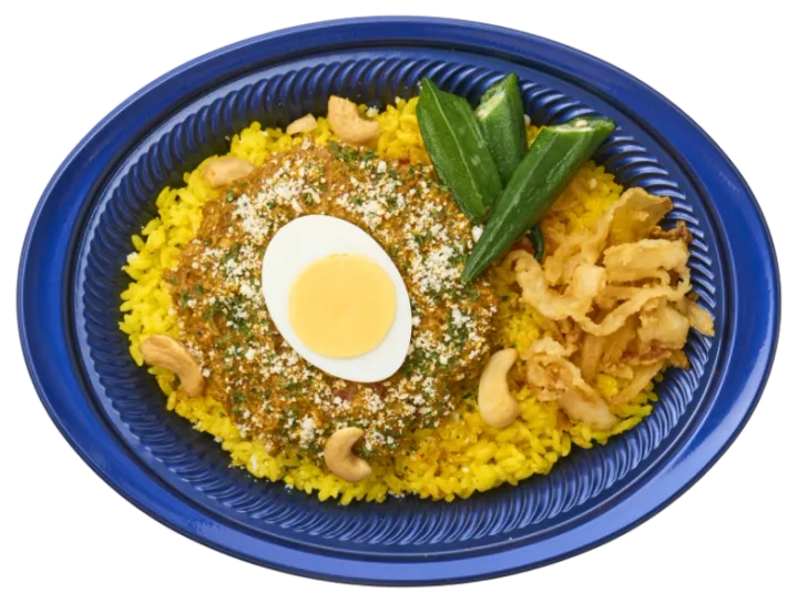 トッピングにはゆで玉子とカシューナッツ、チーズパウダーがのっていて、定番のキーマカレーとはひと味違う味わいを楽しめそう。甘みとスパイスの調和を楽しんでみてください。