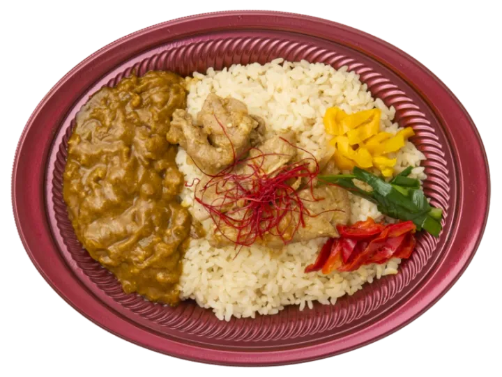 こちらはトマトベースの爽やかな味わいのチキンカレーと、ココナッツベースのマイルドなジャガイモカレーの2種あいがけカレーです。本場の味わいにこだわり、開発者の友人のスリランカ人シェフから教えてもらったレシピを参考に、スリランカのミックススパイス「トゥナパハ」を再現。「カレーリーフ」を取り入れることで、料理全体にその豊かな香りが広がるように仕上げられています。