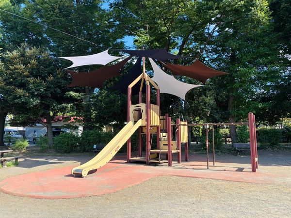 子ども達の大好きな滑り台にも期間限定で日よけテントが設置されました。公園利用者がより快適に公園を利用できるための環境づくりの一つで、今回は【くつろぎ芝生テラスと滑り台上のテント(こかげハウス)】が設置されることになったようです。