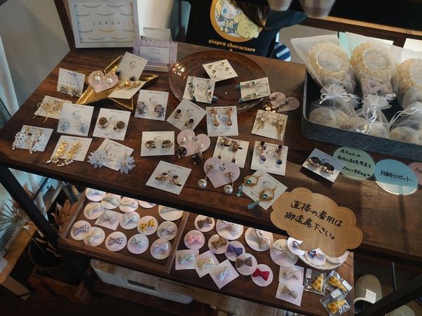 イヤリングやピアス、ロゼット、ヘアピンが並び、どれも細やかな作り込みが感じられます。それなのに大体700円〜1,000円とお手頃価格。