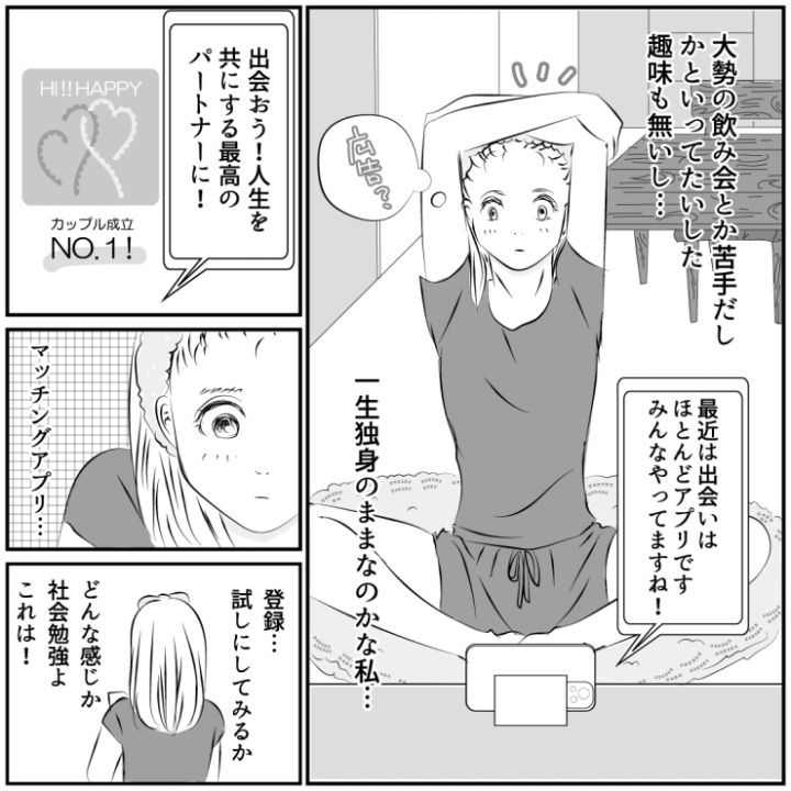 主人公のさゆりはアラサー女子の31歳。最近まわりもどんどん結婚していって、自分に彼氏がいない状況にだんだんと危機感が・・・。まずは試しにマッチングアプリをやってみることにしました。