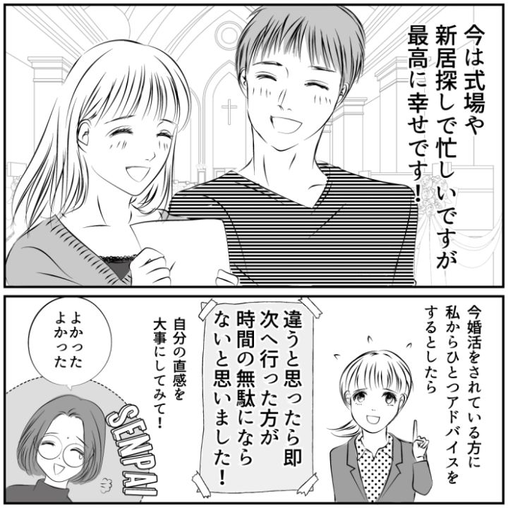 衝撃的な相手にも出会ったマッチングアプリでしたが、結果的にアプリを通して「結婚」という幸せを掴み取った主人公!実際にマッチング婚を成功させた主人公からのアドバイス、ぜひ参考にしてみてくださいね♡