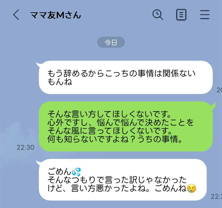 3. 「初めてママ友と揉めました」LINEの一文に我慢できず反省…今後のお付き合いが気まずすぎる