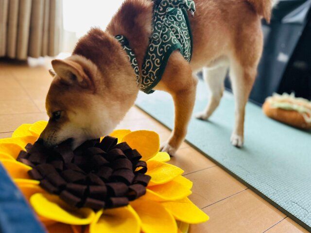 特にお気に入りなのが、ひまわり型のノーズワークマット。明るい色合いで見た目も涼しげ、そして何より、花びらの間におやつを隠すことで、嗅覚と集中力をたっぷり使える工夫になっています。