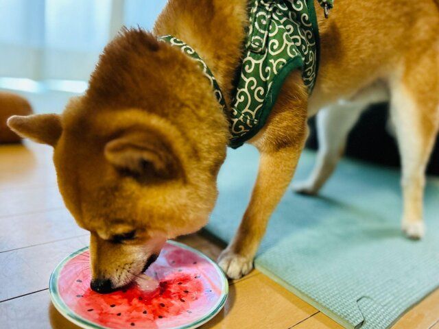 ほんの少しチュールを混ぜた氷を、ニトリで購入したスイカ柄のプレートにのせて。ほんのり風味があるだけで、水を摂るきっかけにもなるし、なめている姿も涼しげで愛らしい。