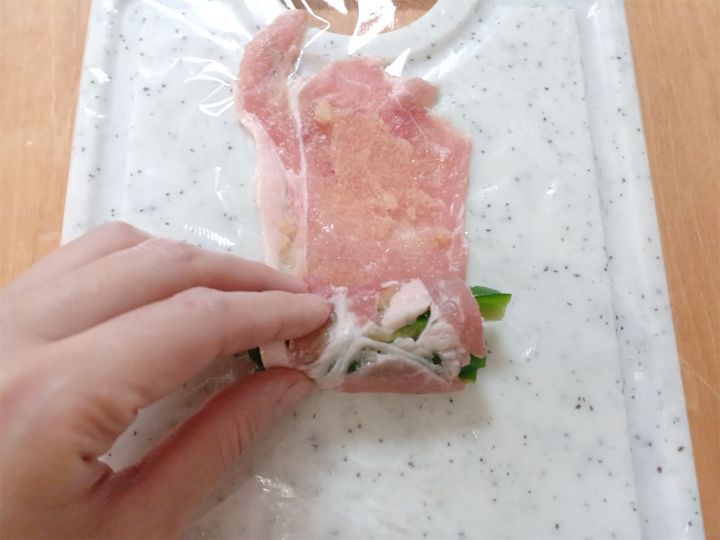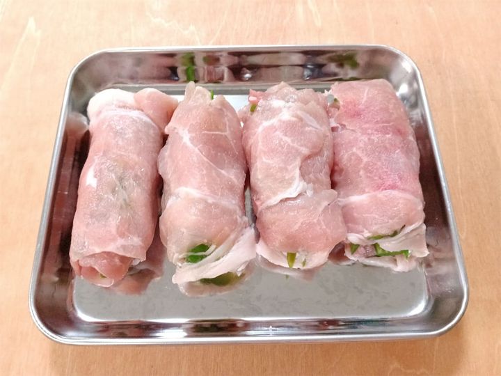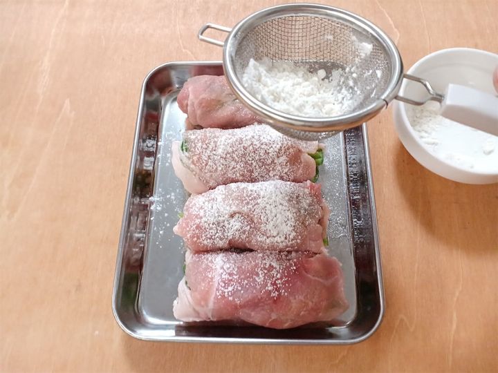 ピーマンがきちんと覆われるように豚肉の両端を少し引っ張るといいですよ。