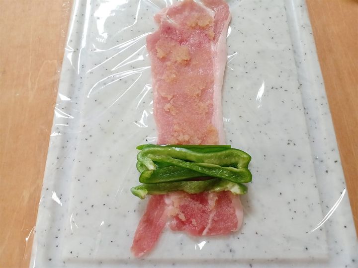 この時に、ピーマンがはみ出ないよう、豚肉の幅に長さを合わせておきましょう。