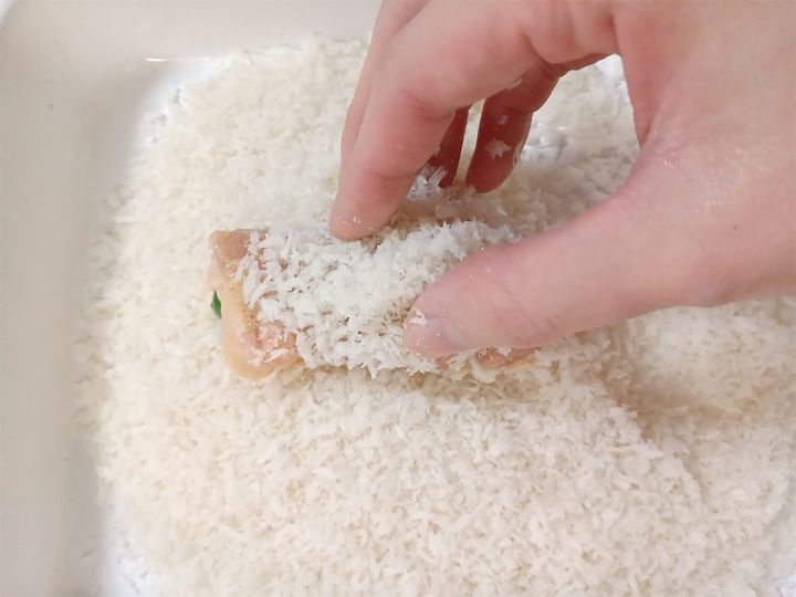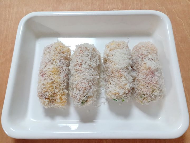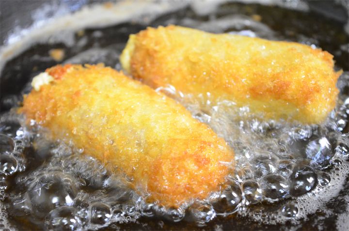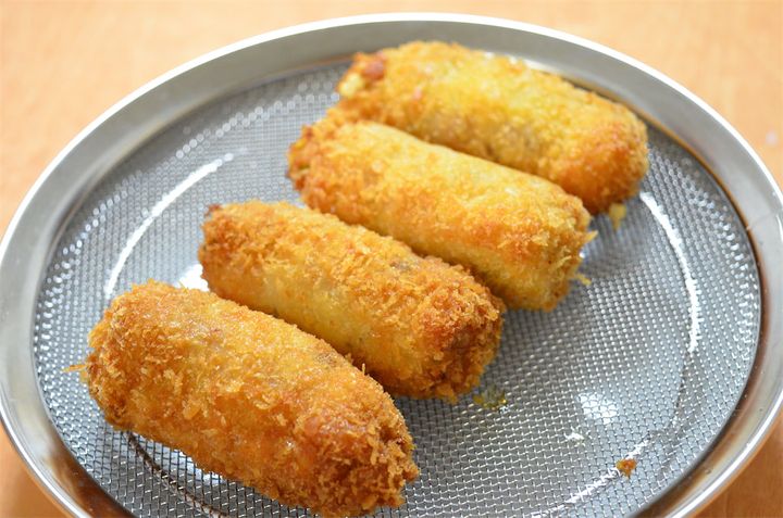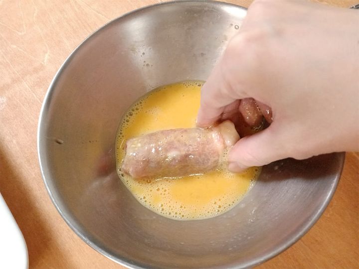 5.4に、小麦粉、卵、パン粉を順にまぶし、油で揚げる。