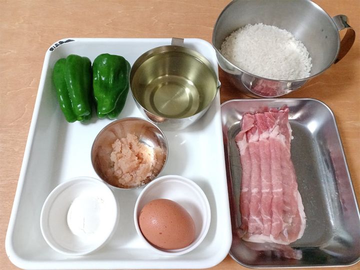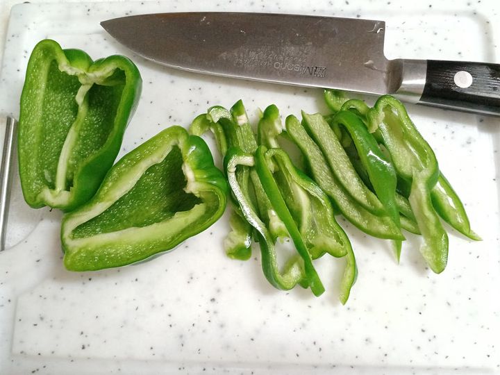 1.ピーマンを縦半分に切り、ヘタを取り、千切りにする。