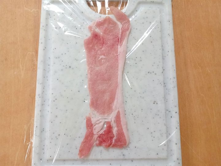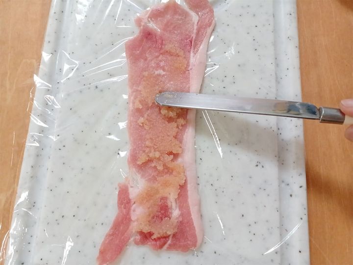 3.まな板にラップをしき、豚肉を幅の狭い方を手前において広げ、ほぐした明太子を塗る。