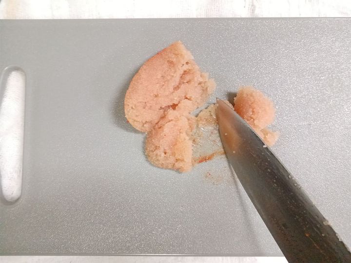 明太子の腹を切り、包丁の背でこそぎましょう。皮は使わないので、ご飯のお供にしてくださいね。