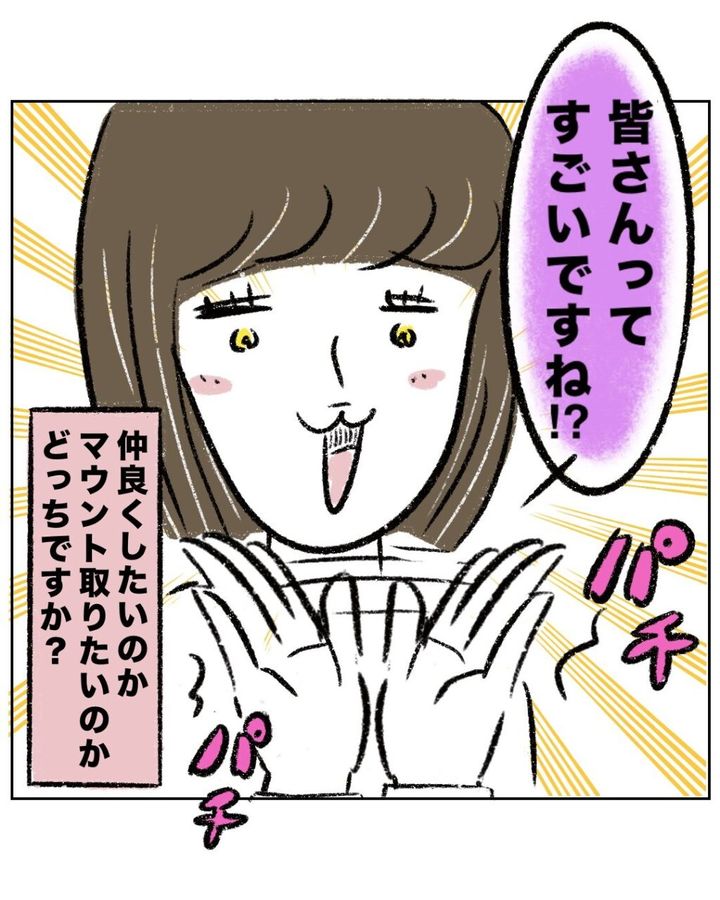 「皆さんってすごいですね!?」そう言って拍手をし始めて、「仲良くしたいのかマウント取りたいのかどっちですか?」と心の中で呟いたのでした。