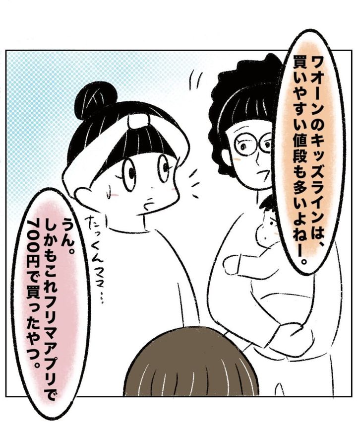 すると、「ワオーンのキッズラインは、買いやすい値段も多いよねー」とたっくんママがやって来ていいました。「うん。しかもこれフリマアプリで700円で買ったやつ。と素直に言うと、