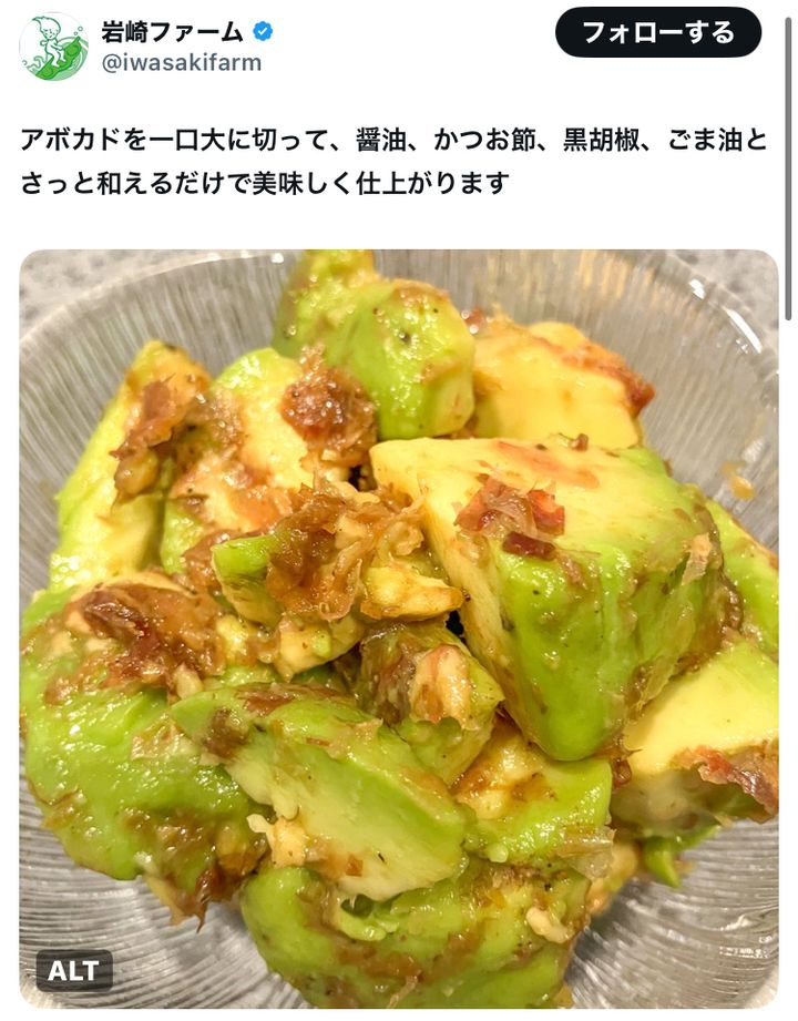農園アカウント「岩崎ファーム(@iwasakifarm)」が投稿した“超手軽アボカドレシピ”がSNSで注目を集めています。
