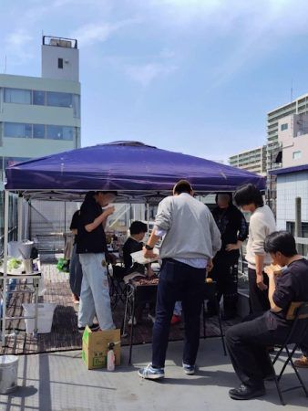 日中の屋上はちょっとしたアウトドア気分が味わえる、気持ちのいい時間が流れる特別な場所。 グループでの集まりにもぴったりです。 取材当日も利用されていたグループがいらしたので写真を撮らせていただきました。
