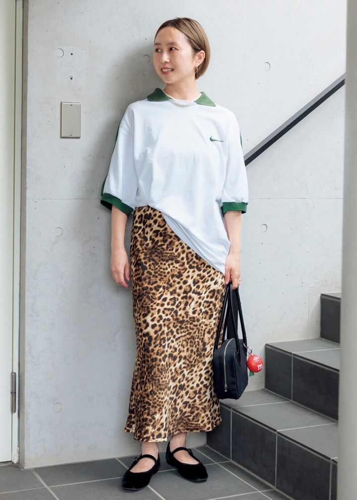 「トレンドのゲームシャツに『オブラダ』のレオパード柄スカートを合わせて、女性らしさを添えました。スポーティなコーデはカジュアルになりすぎないように、きれいめな小物やアクセサリーをプラスしてMIX感を意識するのが、大人の洒落見えのカギだと思います」