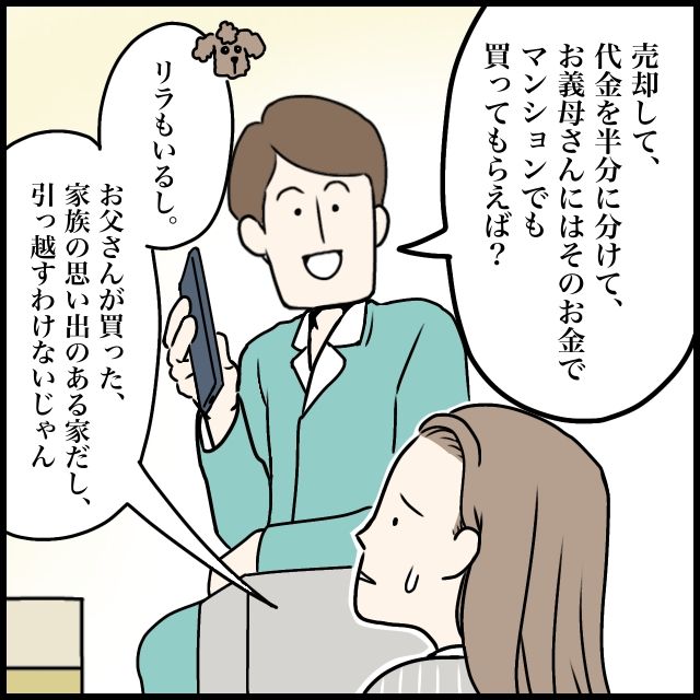 「だから売却して、代金を半分に分けて、お義母さんにはそのお金でマンションでも買ってもらえば?」と、そんなことを考えてたの?私の実家のことを?勝手に?私は困惑しつつも「リラもいるし。お父さんが買った、家族の思い出のある家だし、引越すわけないじゃん。」とハッキリ伝えました。