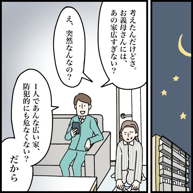父が亡くなってひとりになり、愛犬のリラと暮らす母の今後の生活を心配してくれたナオヤに、金銭面では全く心配することが無いと伝えたのですが、その夜、ナオヤが「お義母さんにはあの家広すぎない?」と実家の話をしてきました。突然どうしたの?微妙な顔をしている私にナオヤは説明を続けました。「1人であんな広い家、防犯的にも危なくない?」