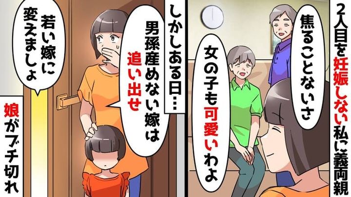 ある夜、娘に「ママ、トイレ」と起こされ私は静かに廊下を歩いていました。そのとき、義両親の部屋から「ハズレ嫁を引いちゃって!息子が不憫だわ」と耳を疑う言葉が聞こえたのです。思わず立ち止まった私の耳に、さらに信じられない言葉が! 義父が「男孫を産めない嫁は追い出せ!若い嫁に変えろ!」と言い放ったのです。まさかの発言に、私は体が固まりました。きっと娘も聞いてしまったのでしょう……。娘は私の手をぎゅっと握り、うつむいたまま動けずにいたのでした。