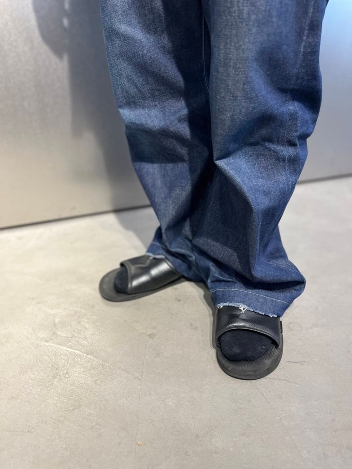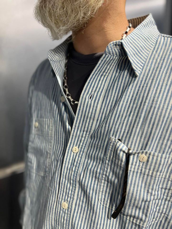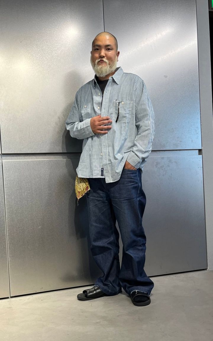 “晩夏スタイル”というリクエストに、美童さんはライトウェイトのワークシャツとフレアデニムをスタイリング。「デニムビスポークで作ったデニムが最大のポイントで、これは70年代のヒッピーに着想を得てオーダーしました。普段は36インチのウエストを40インチに、レッグは50インチの太さに。裾はヒッピーにならって裾はボロボロにしたほうがカッコいいと思って、ルーズなフレアを腰バキしています。購入してから1年半ほど経ちますが、実はまだ一回も洗っていないんです。ヒゲの入り方もイイ感じなので、もっとはき込んで自分のモノにしたいですね」
