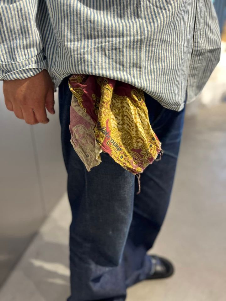 シャツとのバランスもお見事。「洗いざらしで着られるワークシャツもゆったりめを選んで、全体的にだるっとした印象に。ちなみにシャツもデニムも日本ファブリックを使った日本製というのもこだわりです。あと、すごく汗っかきなので(笑)、友人が手がける手拭い専門ブランド【ラジャブルック】の手拭いは晩夏も必需品ですね」