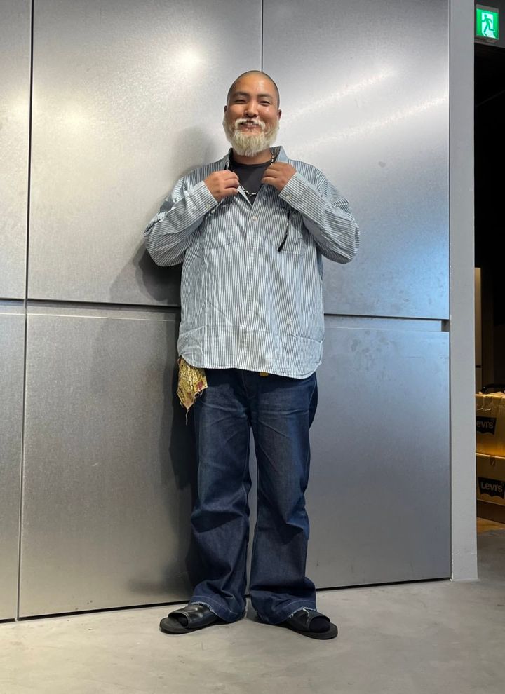 リーバイス®ストア 原宿フラッグシップストアの”顔”として知られ、見た目とは裏腹に物腰が柔らかく、かつ豊富な知識でお客さんからの信頼も厚い。トレードマークの白ヒゲは、2週間の1回のブリーチでキープしているそう。大の愛妻家でもあり、本日は10年前に奥さまから贈られたナバホ族のネックレスを着けて登場してくれた。