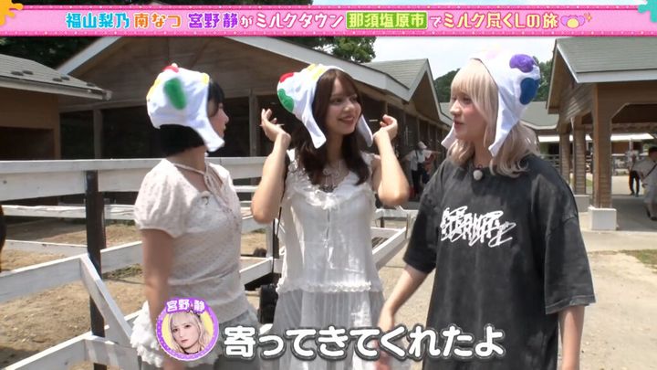 8月9日(土)の前半バラエティパートは、「ミルクの魅力たっぷり勉強!ミルク尽くしの旅in那須塩原市」を放送。CANDY TUNEの福山梨乃、南なつ、宮野静が栃木県那須塩原市にある那須千本松牧場を訪れる。同所は年間約100万人が来場する“ASOBI”スポットで「牧場が今一番行きたいところだったので夢が叶っています!」という福山は、開始早々「調子いかがですか~!?」と牧場内の牛たちに声をかけるなど、念願叶った様子だ。