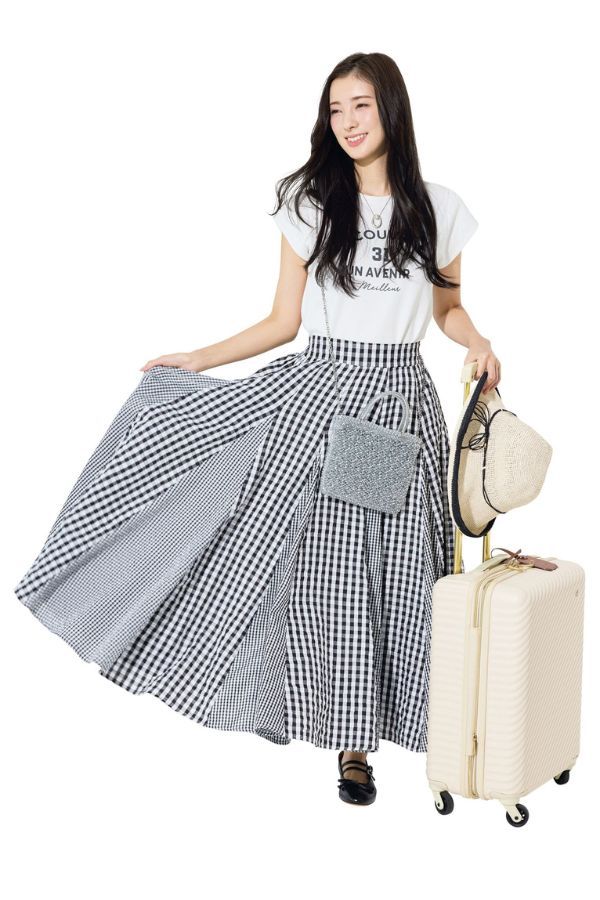 バッグ¥50,600/アンテプリマ/ワイヤーバッグ(アンテプリマジャパン) Tシャツ¥5,940/31 Sons de mode(ダブルエー) スカート¥12,100/BayBee ネックレス¥22,000/フィリップオーディベール(アンタイトル) 帽子¥19,580/CA4LA(CA4LA プレスルーム) キャリーケース¥37,400/ハント×ジュエルナローズ(ジュエルナローズ新宿サブナード店) 靴¥40,700/CHEMBUR(クルーズ ショールーム)