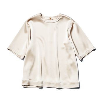 ベージュサテンTシャツ/ウィム ガゼット(ウィム ガゼット ルミネ新宿店) コットンTシャツの気楽さと、ブラウスのきちんと感のいいとこ取り。サテンの光沢が肌に映えて、夏の陽射しを受けると上品に輝く。Tシャツだから涼しいのに、見た目は断然大人っぽい。