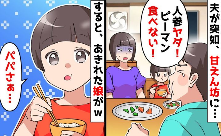 そして、娘はそのままスーッと部屋から出ていってしまったのです。それにも気づかず、話し続ける夫。夕飯のメニューを見て、「人参ヤダ! ピーマン食べない! たーべーなーいー! 僕ちん、野菜は食べたくないでちゅ~う♪」と文句を言い出し、私は気が遠くなりました。