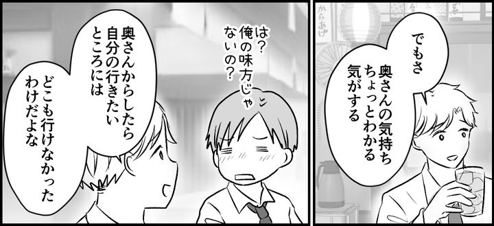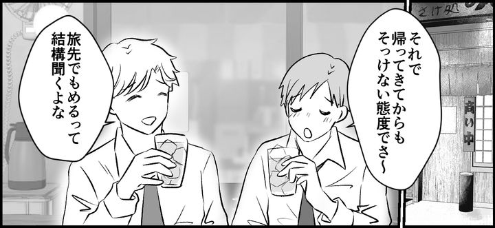 旅行中、妻がキレてしまって、俺たちの雰囲気はギスギスしたものに。旅行から帰ってきたあともその険悪な雰囲気は続いていた。仕事をしながらため息をついていると、同僚から声をかけられた。「まあ、いろいろあるよな。じゃ、今日飲み行くか」俺は誘いにのることにする。そして旅行の話を同僚にしたんだ。